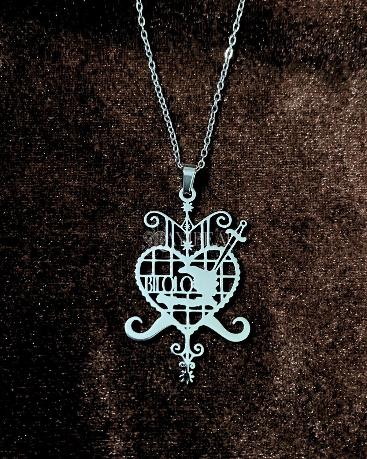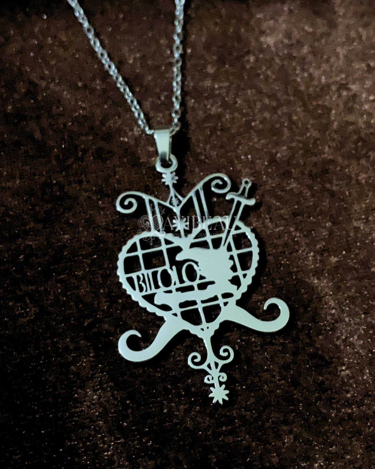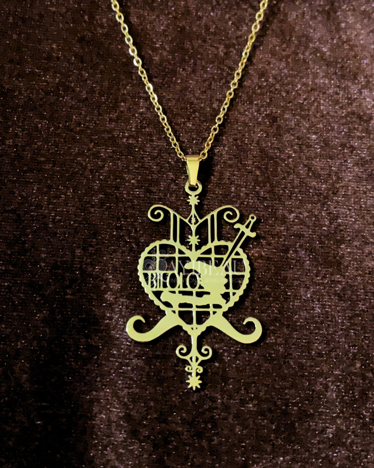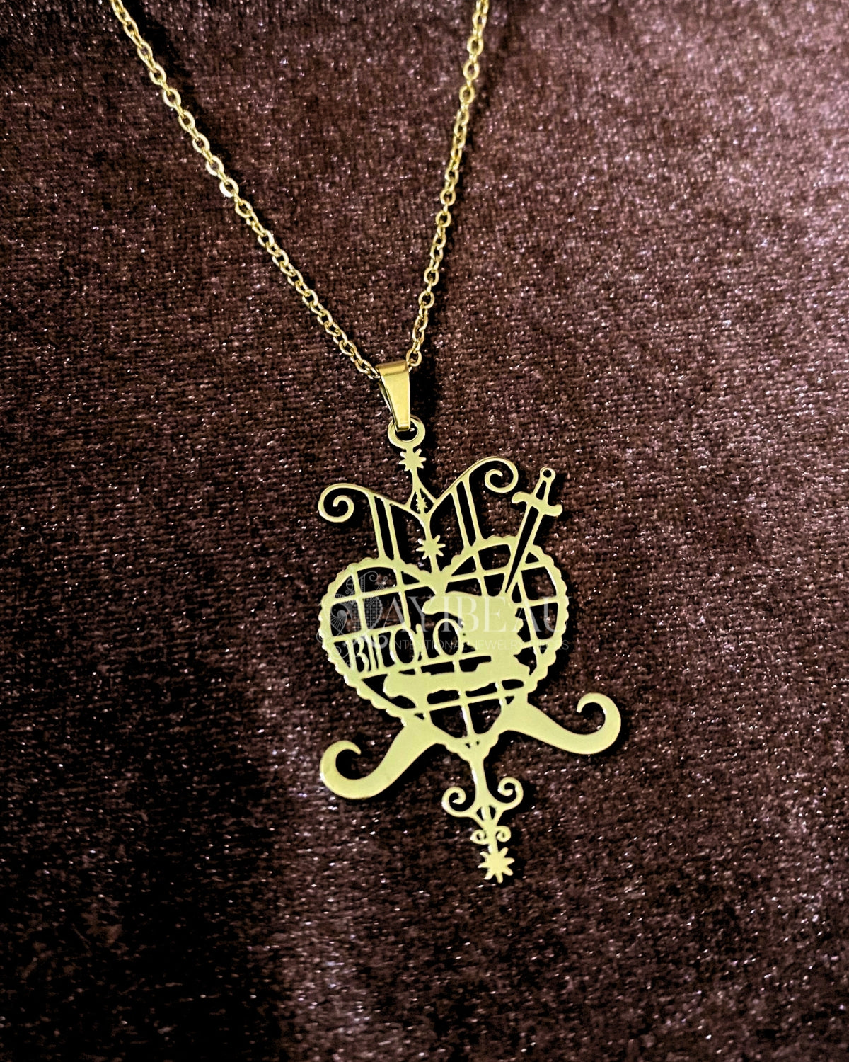 Èzili Dantò is the ultimate protector of women and children, embodying strength and maternal love. This pendant is styled in her vèvè with the map of haiti and the words "Bilolo" inscribed inside the heart. This pendant is all about empowerment and protection. Wear it, and feel the love and protection wrap around you like a warm hug.